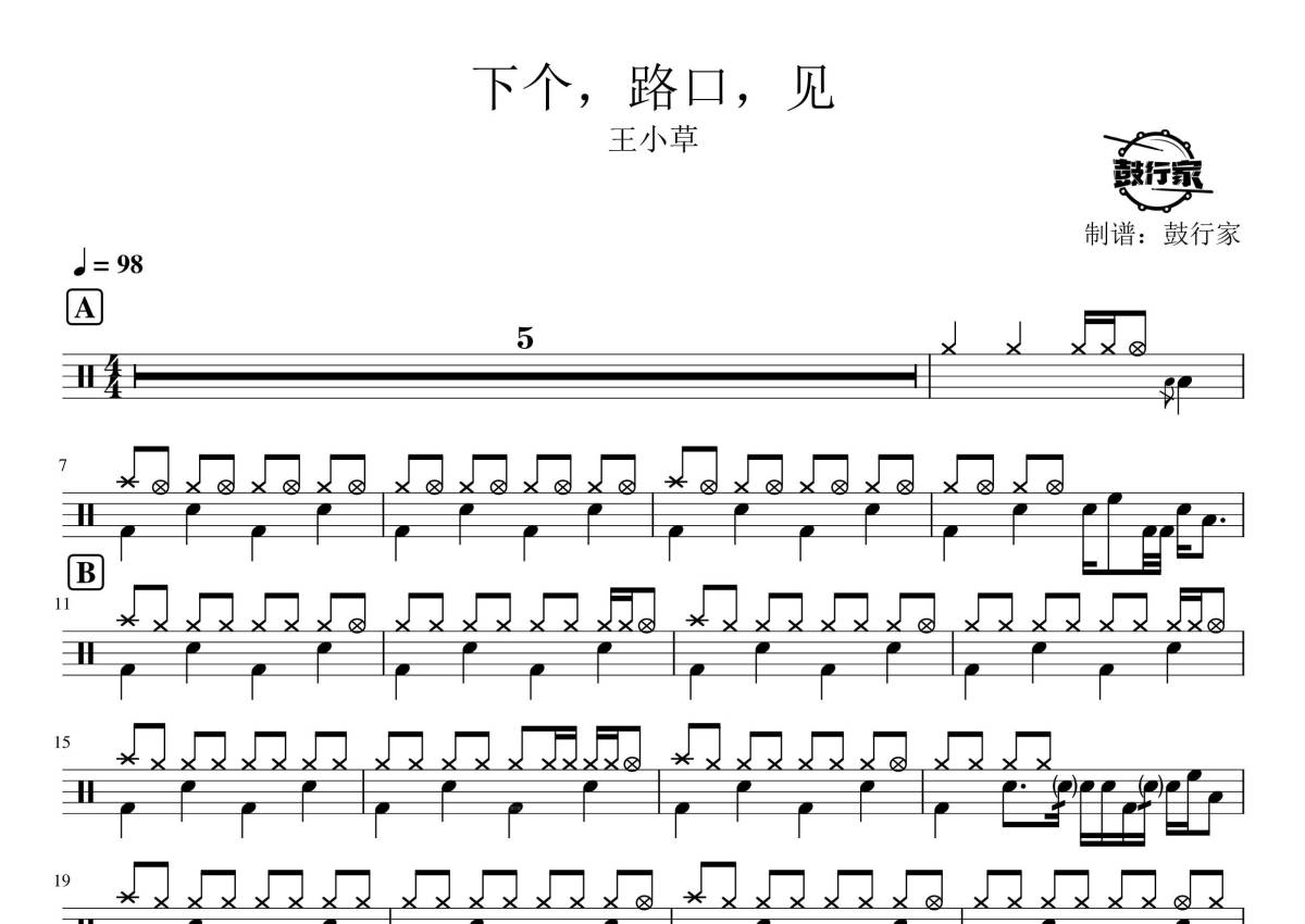 《下个,路口,见》是王小草演唱的一首歌曲,拍号为4/4拍,歌曲速度为每分钟98拍,这份架子鼓谱共有两张高清图谱,图谱由 @鼓行家 编配上传,图谱使用五线谱编配,使用这份下个,路口,见架子鼓谱,你将能够轻松地敲打出这首王小草的下个,路口,见,快来尝试吧。