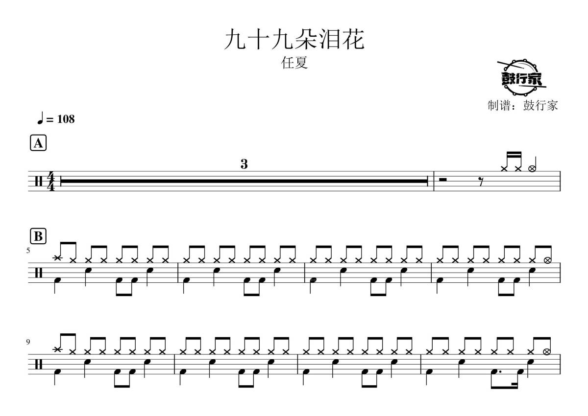 《九十九朵泪花》是任夏演唱的一首歌曲,拍号为4/4拍,歌曲速度为每分钟108拍,这份架子鼓谱共有两张高清图谱,图谱由 @鼓行家 编配上传,图谱使用五线谱编配,使用这份九十九朵泪花架子鼓谱,你将能够轻松地敲打出这首任夏的九十九朵泪花,快来尝试吧。