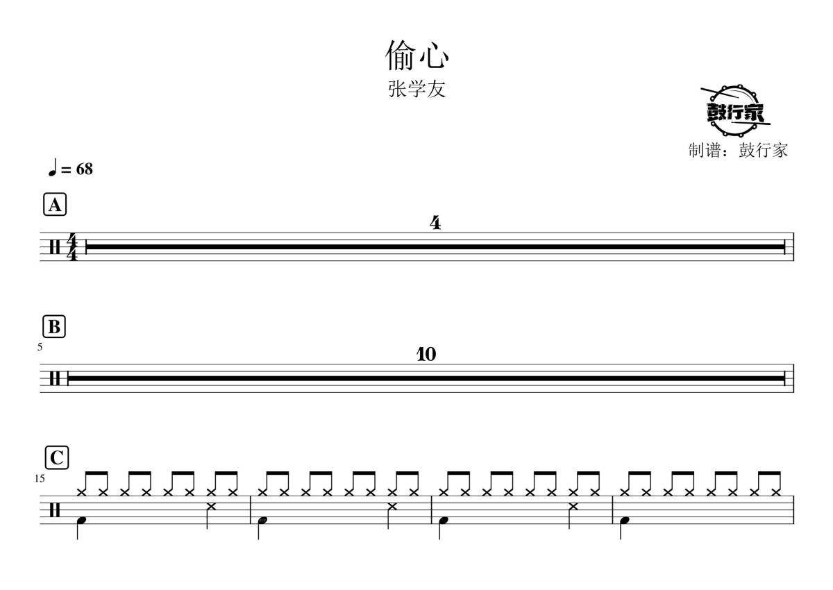 《偷心》是张学友演唱的一首歌曲,拍号为4/4拍,歌曲速度为每分钟68拍,这份架子鼓谱共有两张高清图谱,图谱由 @鼓行家 编配上传,图谱使用五线谱编配,使用这份偷心架子鼓谱,你将能够轻松地敲打出这首张学友的偷心,快来尝试吧。