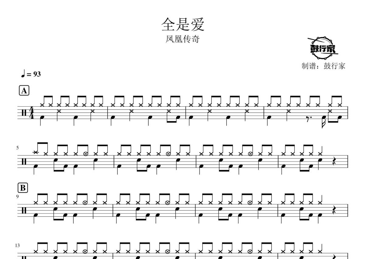 《全是爱》是凤凰传奇演唱的一首歌曲,拍号为4/4拍,歌曲速度为每分钟93拍,这份架子鼓谱共有三张高清图谱,图谱由 @鼓行家 编配上传,图谱使用五线谱编配,使用这份全是爱架子鼓谱,你将能够轻松地敲打出这首凤凰传奇的全是爱,快来尝试吧。
