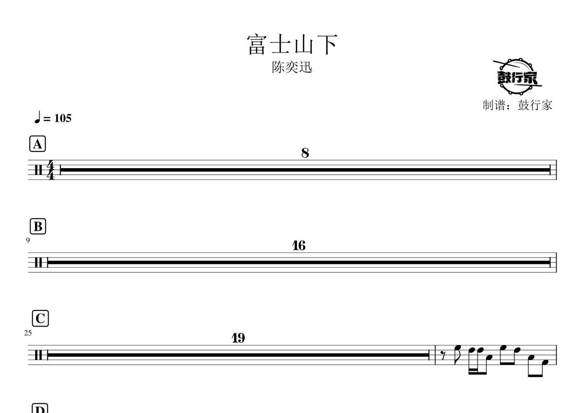 《富士山下》是陈奕迅演唱的一首歌曲,拍号为4/4拍,歌曲速度为每分钟105拍,这份架子鼓谱共有两张高清图谱,图谱由 @鼓行家 编配上传,图谱使用五线谱编配,使用这份富士山下架子鼓谱,你将能够轻松地敲打出这首陈奕迅的富士山下,快来尝试吧。