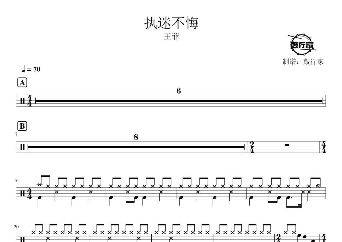 《执迷不悔》是王菲演唱的一首歌曲,拍号为4/4拍,歌曲速度为每分钟70拍,这份架子鼓谱共有两张高清图谱,图谱由 @鼓行家 编配上传,图谱使用五线谱编配,使用这份执迷不悔架子鼓谱,你将能够轻松地敲打出这首王菲的执迷不悔,快来尝试吧。