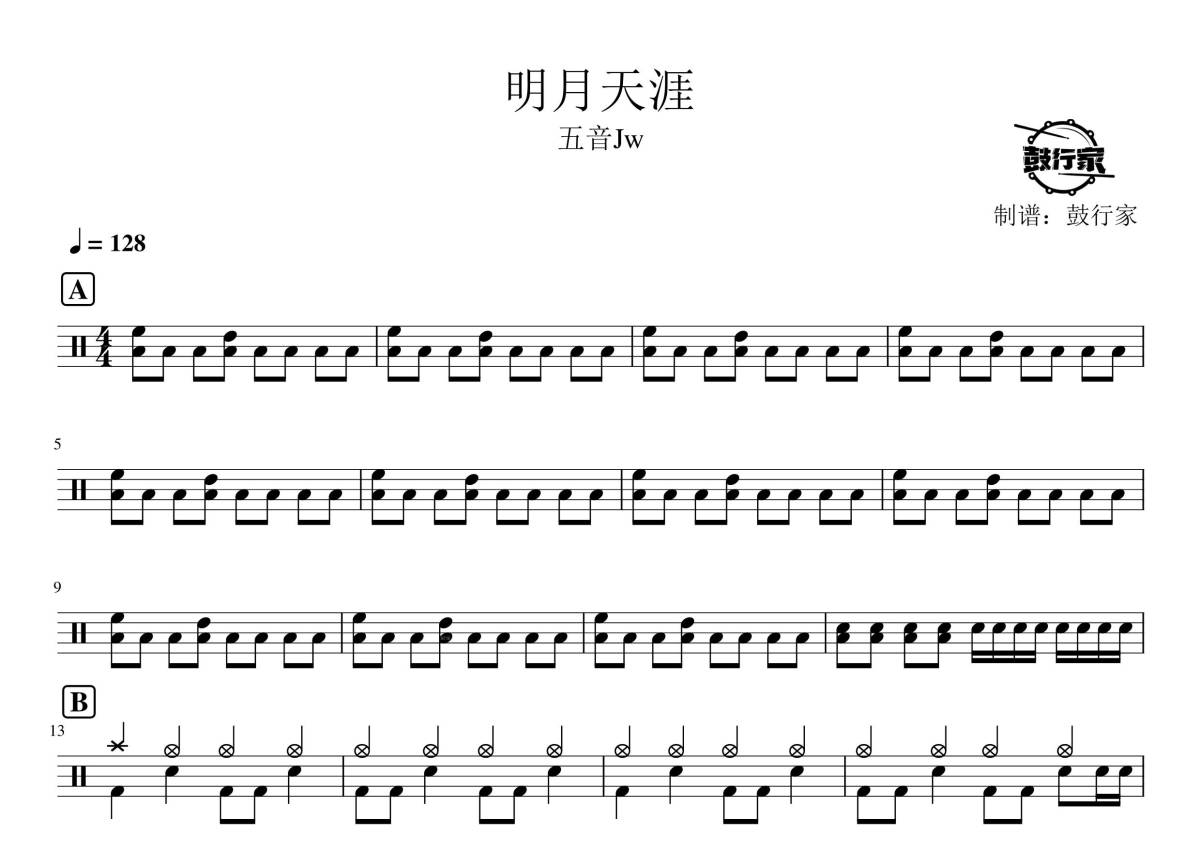 《明月天涯》是五音Jw演唱的一首歌曲,拍号为4/4拍,歌曲速度为每分钟128拍,这份架子鼓谱共有三张高清图谱,图谱由 @鼓行家 编配上传,图谱使用五线谱编配,使用这份明月天涯架子鼓谱,你将能够轻松地敲打出这首五音Jw的明月天涯,快来尝试吧。