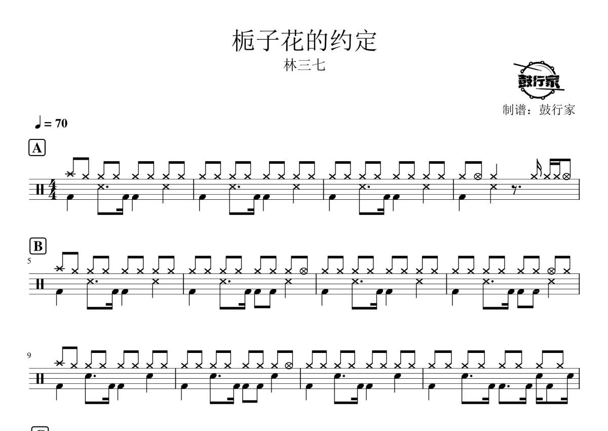 《栀子花的约定》是林三七演唱的一首歌曲,拍号为4/4拍,歌曲速度为每分钟70拍,这份架子鼓谱共有两张高清图谱,图谱由 @鼓行家 编配上传,图谱使用五线谱编配,使用这份栀子花的约定架子鼓谱,你将能够轻松地敲打出这首林三七的栀子花的约定,快来尝试吧。