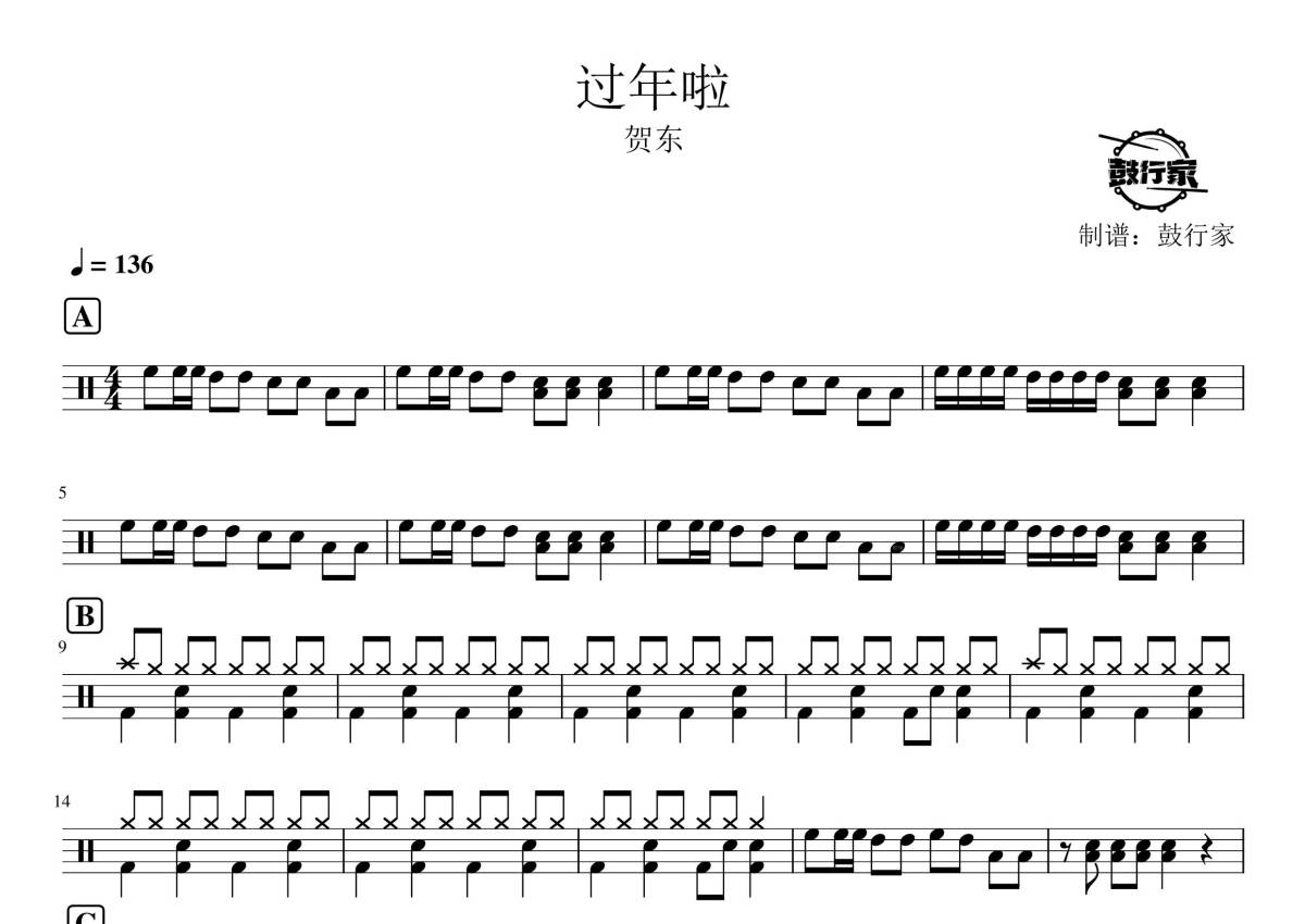 《过年啦》是贺东演唱的一首歌曲,拍号为4/4拍,歌曲速度为每分钟136拍,这份架子鼓谱共有三张高清图谱,图谱由 @鼓行家 编配上传,图谱使用五线谱编配,使用这份过年啦架子鼓谱,你将能够轻松地敲打出这首贺东的过年啦,快来尝试吧。