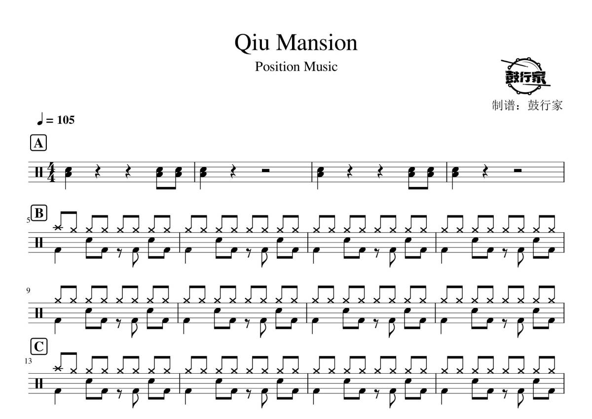 《Qiu Mansion》是Position Music演唱的一首歌曲,拍号为4/4拍,歌曲速度为每分钟105拍,这份架子鼓谱共有一张高清图谱,图谱由 @鼓行家 编配上传,图谱使用五线谱编配,使用这份Qiu Mansion架子鼓谱,你将能够轻松地敲打出这首Position Music的Qiu Mansion,快来尝试吧。