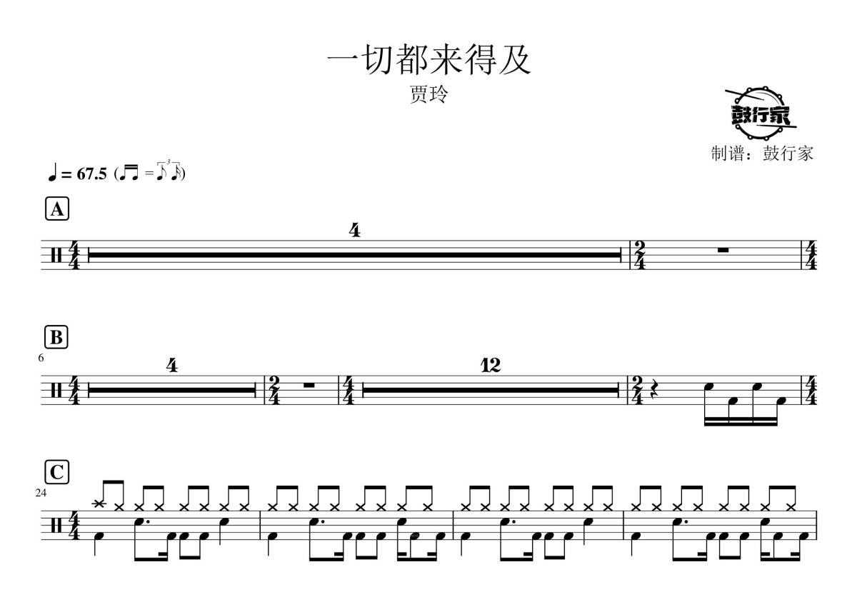 《一切都来得及》是贾玲演唱的一首歌曲,拍号为4/4拍,歌曲速度为每分钟67.5拍,这份架子鼓谱共有两张高清图谱,图谱由 @鼓行家 编配上传,图谱使用五线谱编配,使用这份一切都来得及架子鼓谱,你将能够轻松地敲打出这首贾玲的一切都来得及,快来尝试吧。