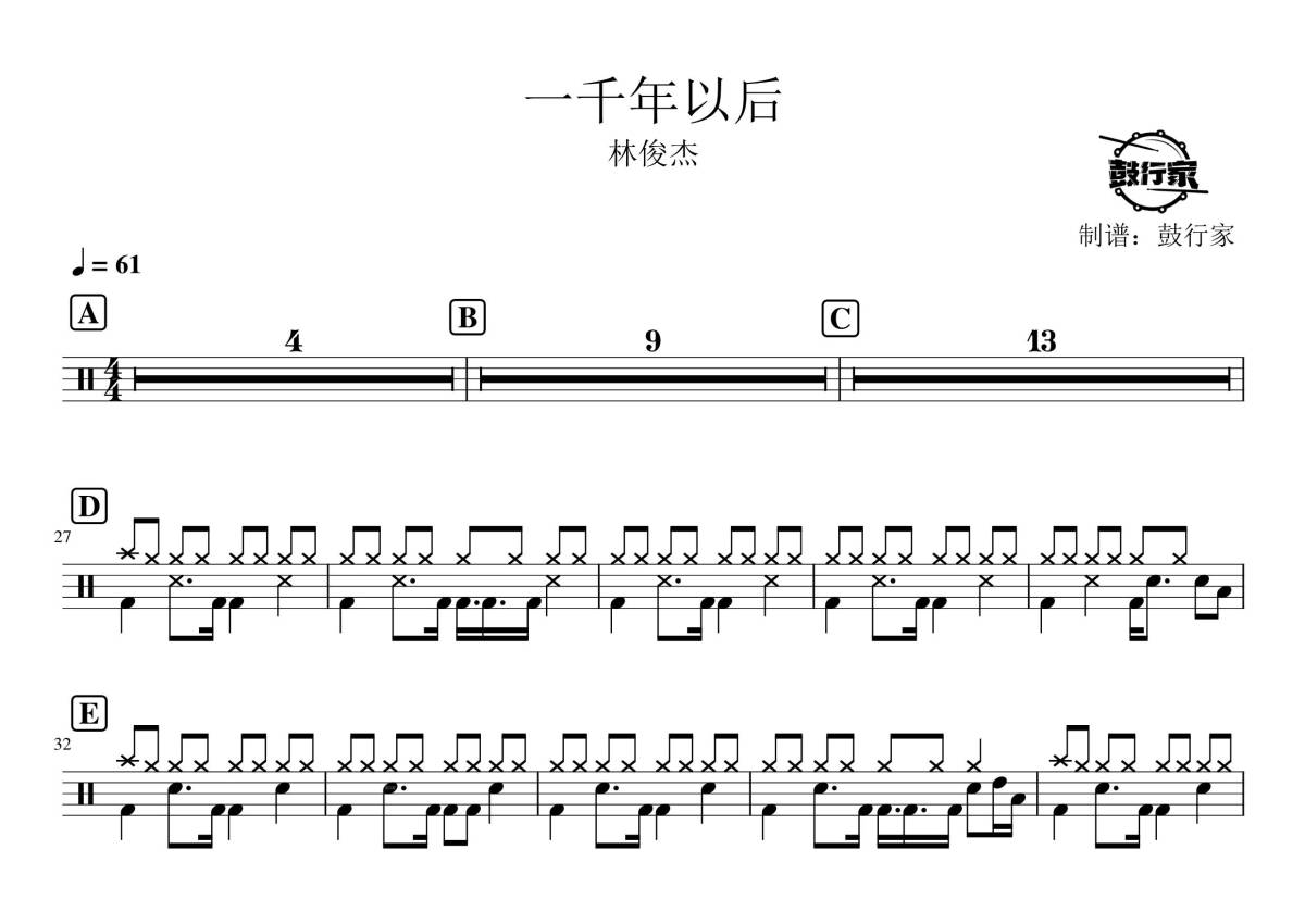 《一千年以后》是林俊杰演唱的一首歌曲,拍号为4/4拍,歌曲速度为每分钟61拍,这份架子鼓谱共有一张高清图谱,图谱由 @鼓行家 编配上传,图谱使用五线谱编配,使用这份一千年以后架子鼓谱,你将能够轻松地敲打出这首林俊杰的一千年以后,快来尝试吧。