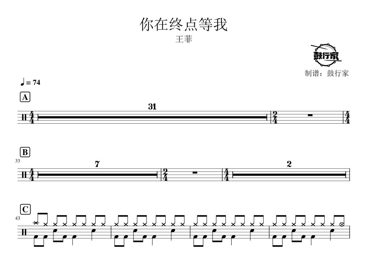 《你在终点等我》是王菲演唱的一首歌曲,拍号为4/4拍,歌曲速度为每分钟74拍,这份架子鼓谱共有两张高清图谱,图谱由 @鼓行家 编配上传,图谱使用五线谱编配,使用这份你在终点等我架子鼓谱,你将能够轻松地敲打出这首王菲的你在终点等我,快来尝试吧。