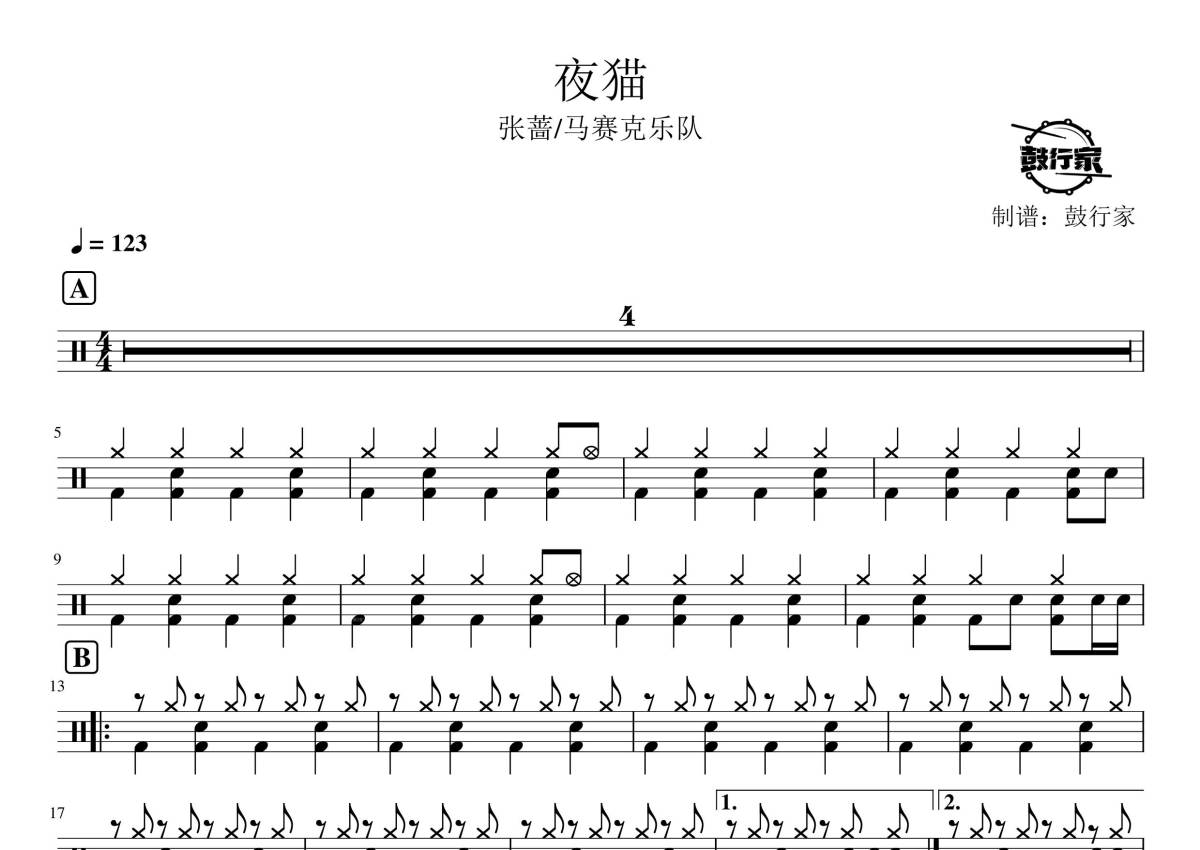 《夜猫》是张蔷演唱的一首歌曲,拍号为4/4拍,歌曲速度为每分钟123拍,这份架子鼓谱共有两张高清图谱,图谱由 @鼓行家 编配上传,图谱使用五线谱编配,使用这份夜猫架子鼓谱,你将能够轻松地敲打出这首张蔷的夜猫,快来尝试吧。