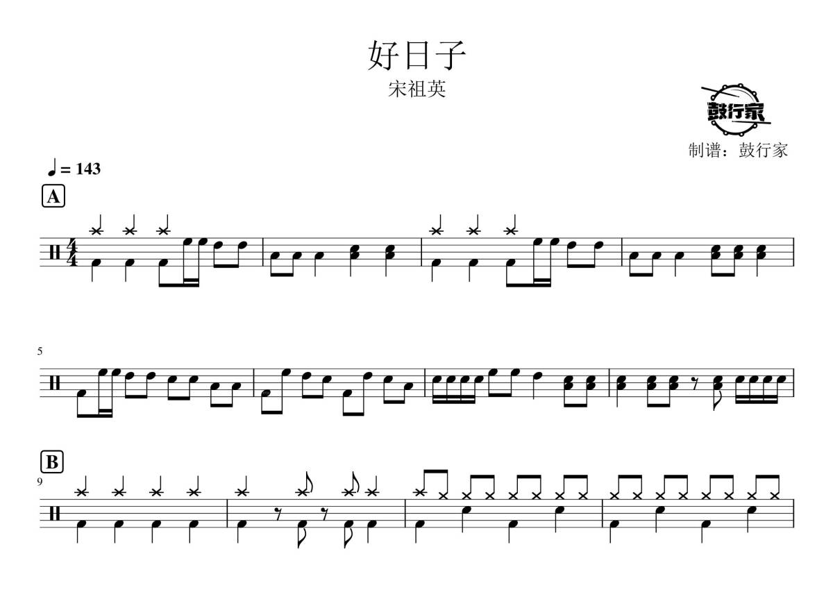 《好日子》是宋祖英演唱的一首歌曲,拍号为4/4拍,歌曲速度为每分钟143拍,这份架子鼓谱共有三张高清图谱,图谱由 @鼓行家 编配上传,图谱使用五线谱编配,使用这份好日子架子鼓谱,你将能够轻松地敲打出这首宋祖英的好日子,快来尝试吧。