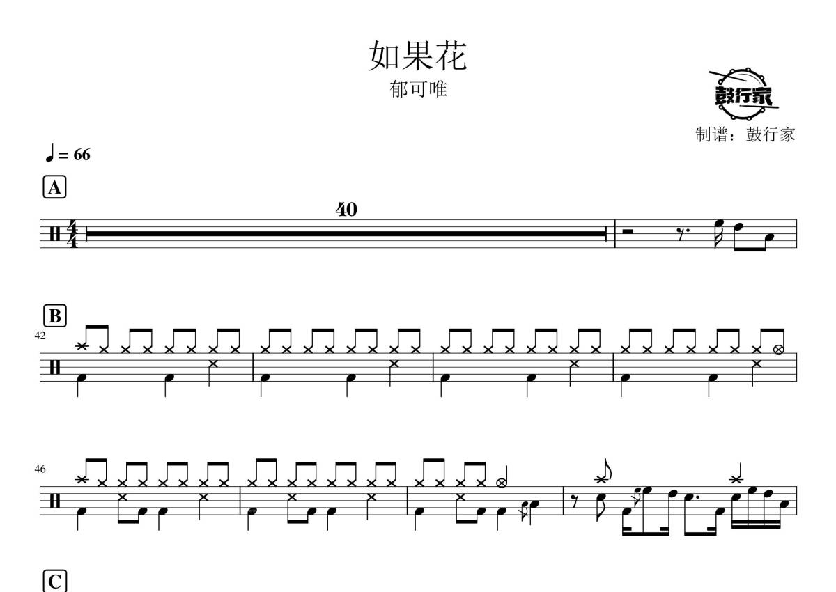 《如果花》是郁可唯演唱的一首歌曲,拍号为4/4拍,歌曲速度为每分钟66拍,这份架子鼓谱共有一张高清图谱,图谱由 @鼓行家 编配上传,图谱使用五线谱编配,使用这份如果花架子鼓谱,你将能够轻松地敲打出这首郁可唯的如果花,快来尝试吧。