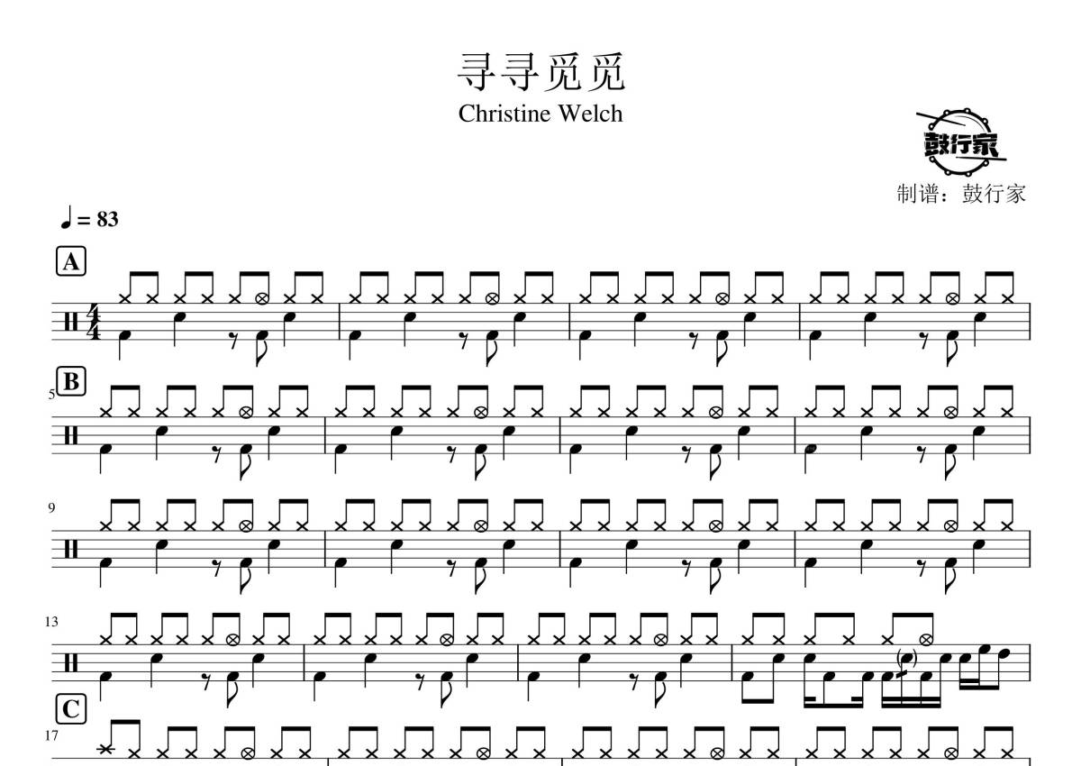 《寻寻觅觅》是Christine Welch演唱的一首歌曲,拍号为4/4拍,歌曲速度为每分钟83拍,这份架子鼓谱共有两张高清图谱,图谱由 @鼓行家 编配上传,图谱使用五线谱编配,使用这份寻寻觅觅架子鼓谱,你将能够轻松地敲打出这首Christine Welch的寻寻觅觅,快来尝试吧。