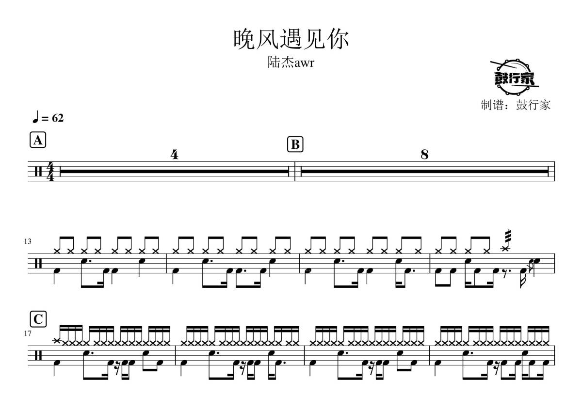 《晚风遇见你》是陆杰awr演唱的一首歌曲,拍号为4/4拍,歌曲速度为每分钟62拍,这份架子鼓谱共有两张高清图谱,图谱由 @鼓行家 编配上传,图谱使用五线谱编配,使用这份晚风遇见你架子鼓谱,你将能够轻松地敲打出这首陆杰awr的晚风遇见你,快来尝试吧。