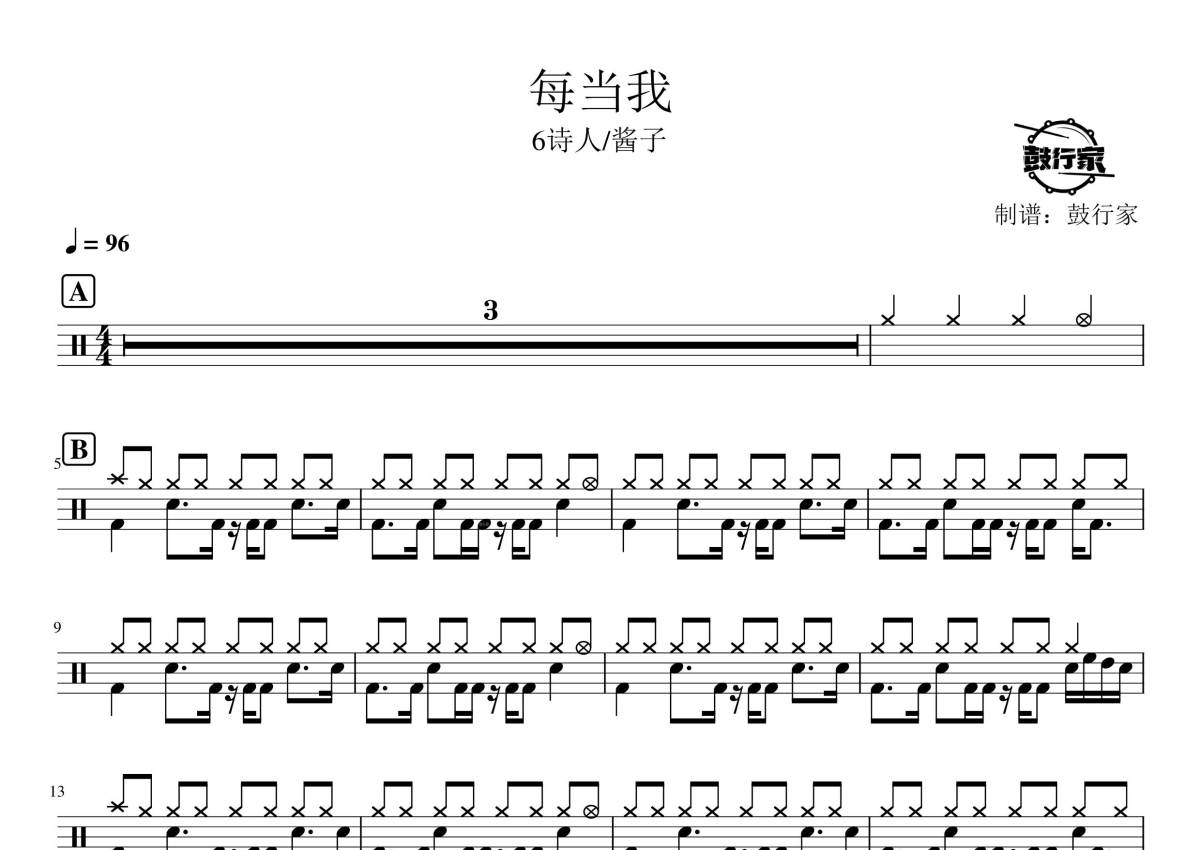 《每当我》是6诗人/酱子演唱的一首歌曲,拍号为4/4拍,歌曲速度为每分钟96拍,这份架子鼓谱共有两张高清图谱,图谱由 @鼓行家 编配上传,图谱使用五线谱编配,使用这份每当我架子鼓谱,你将能够轻松地敲打出这首6诗人/酱子的每当我,快来尝试吧。