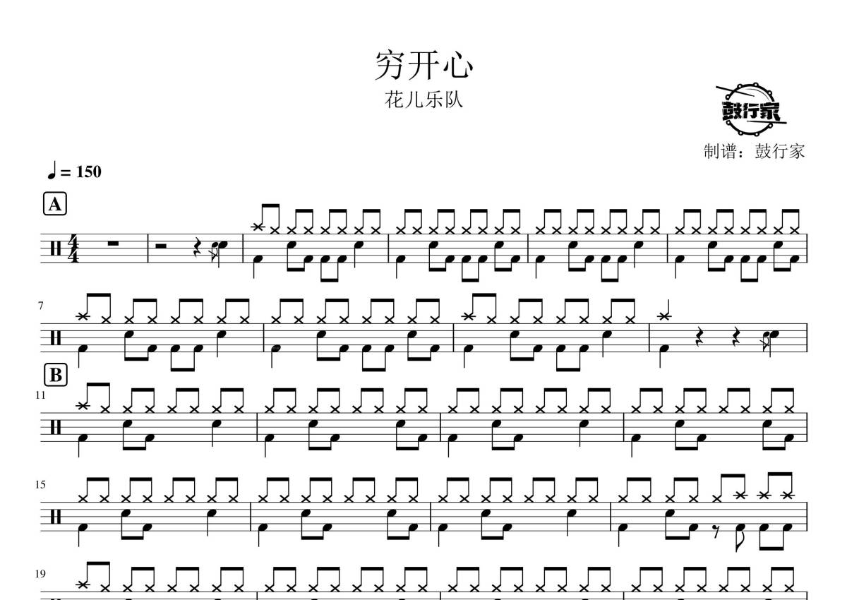 《穷开心》是花儿乐队演唱的一首歌曲,拍号为4/4拍,歌曲速度为每分钟150拍,这份架子鼓谱共有两张高清图谱,图谱由 @鼓行家 编配上传,图谱使用五线谱编配,使用这份穷开心架子鼓谱,你将能够轻松地敲打出这首花儿乐队的穷开心,快来尝试吧。