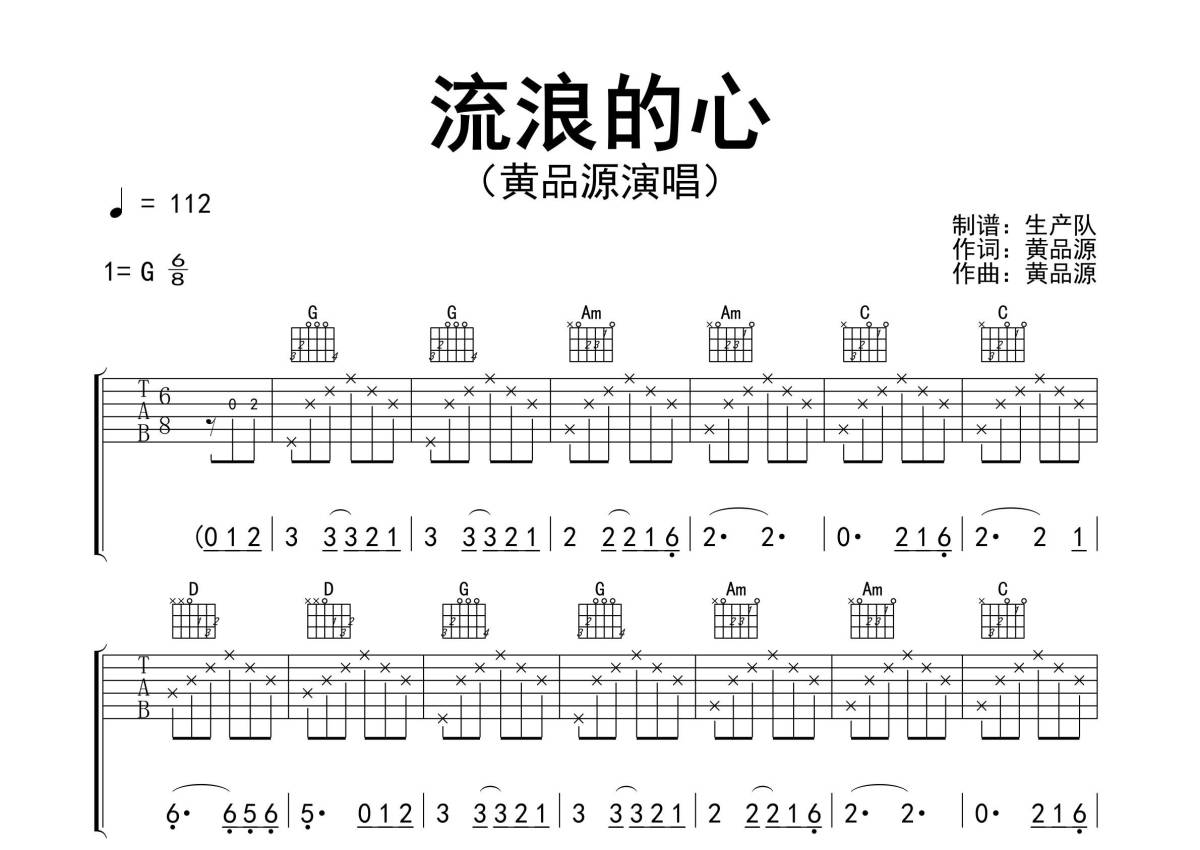 《流浪的心》是黄品源演唱的一首歌曲,精编完美版,拍号为6/8拍,歌曲速度为每分钟112拍,歌曲原调为G调,本吉他谱采用的是G调指法编配,演奏时不需要使用变调夹即为原调,这份吉他谱共有三张高清图谱,图谱由 @生产队 编配上传,图谱使用六线谱编配,包含吉他和弦指法、简谱以及歌词部分,使用这份流浪的心吉他谱,可以让你更加方便地掌握这首歌曲的弹唱技巧,快来尝试吧。《流浪的心》是由黄品源作词、作曲并演唱一首歌曲,收录于专辑《谁能让时间倒转》。本吉他谱根据原版G调指法编配,完整的前奏、间奏、尾奏编配,怀旧经典!。