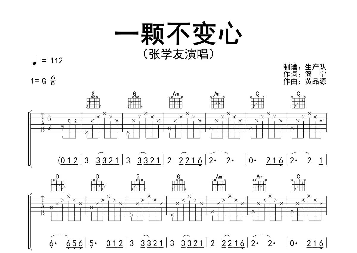 《一颗不变心》是张学友演唱的一首歌曲,精编完美版,拍号为6/8拍,歌曲速度为每分钟112拍,歌曲原调为G调,本吉他谱采用的是G调指法编配,演奏时不需要使用变调夹即为原调,这份吉他谱共有三张高清图谱,图谱由 @生产队 编配上传,图谱使用六线谱编配,包含吉他和弦指法、简谱以及歌词部分,使用这份一颗不变心吉他谱,可以让你更加方便地掌握这首歌曲的弹唱技巧,快来尝试吧。《一颗不变心》是由黄品源作曲,简宁作词,张学友演唱的粤语歌曲,收录于同名专辑《一颗不变心》中。本吉他谱根据原版G调指法编配,完整的前奏、间奏、尾奏和SOLO编配,怀旧经典!。