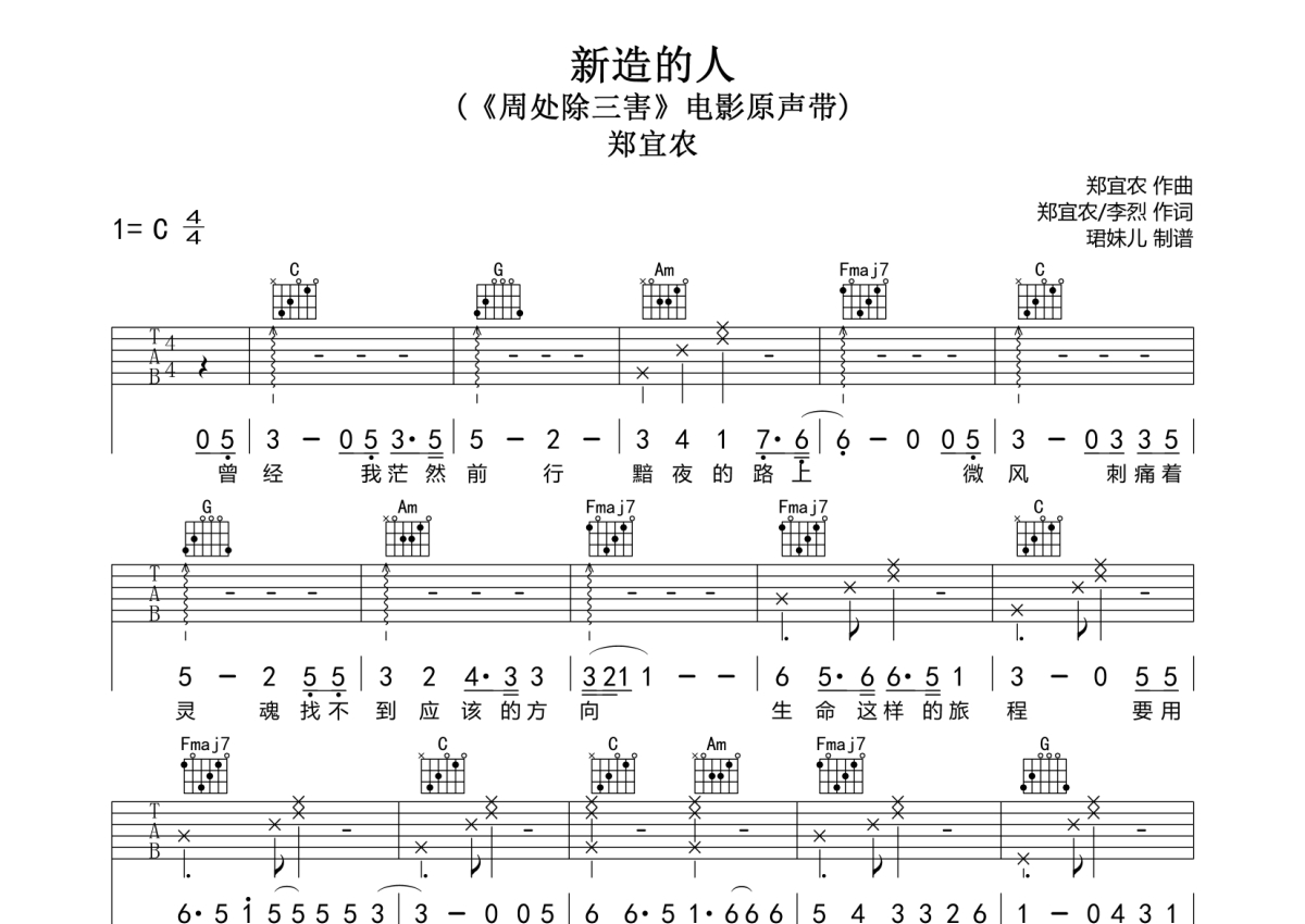 《新造的人》是郑宜农演唱的一首歌曲,拍号为4/4拍,歌曲速度为每分钟85拍,歌曲原调为C调,本吉他谱采用的是C调指法编配,演奏时不需要使用变调夹即为原调,这份吉他谱共有两张高清图谱,图谱由 @珺妹儿 编配上传,图谱使用六线谱编配,包含吉他和弦指法、简谱以及歌词部分,使用这份新造的人吉他谱,可以让你更加方便地掌握这首歌曲的弹唱技巧,快来尝试吧。