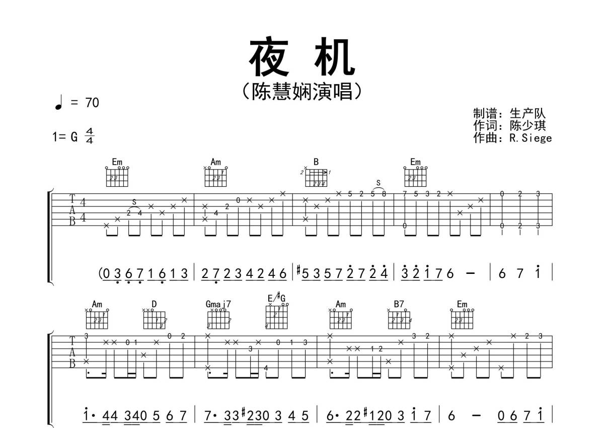 《夜机》是陈慧娴演唱的一首歌曲,精编完美版,拍号为4/4拍,歌曲速度为每分钟70拍,歌曲原调为G调,本吉他谱采用的是G调指法编配,演奏时不需要使用变调夹即为原调,这份吉他谱共有三张高清图谱,图谱由 @生产队 编配上传,图谱使用六线谱编配,包含吉他和弦指法、简谱以及歌词部分,使用这份夜机吉他谱,可以让你更加方便地掌握这首歌曲的弹唱技巧,快来尝试吧。《夜机》是由陈少琪作词,R. Siegel、Robert Jung作曲,卢东尼编曲,陈慧娴演唱的一首经典歌曲,收录于专辑《永远是你的朋友》中。本吉他谱根据原版G调指法编配,精准的前奏,间奏,尾奏和SOLO编配,精编完美版,怀旧经典!。