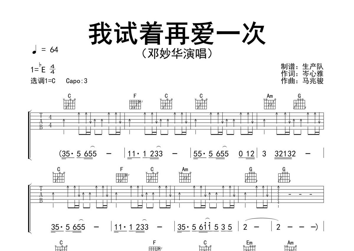 《我试着再爱一次》是邓妙华演唱的一首歌曲,精编民谣版,拍号为4/4拍,歌曲速度为每分钟64拍,歌曲原调为Eb调,但由于原调指法比较难,为了方便弹奏,本吉他谱采用的是C调指法编配,变调夹3品弹奏即为原调,当然也可以根据自己的音域改变变调夹位置,或者通过改变和弦调性,以方便自己弹奏,这份吉他谱共有两张高清图谱,图谱由 @生产队 编配上传,图谱使用六线谱编配,包含吉他和弦指法、简谱以及歌词部分,使用这份我试着再爱一次吉他谱,可以让你更加方便地掌握这首歌曲的弹唱技巧,快来尝试吧。《我试着再爱一次》是一首邓妙华演唱的歌曲,由岑心雅作词、马兆骏作曲,收录于1989年4月·7日发行的《邓妙华经典15首》专辑中。本吉他谱根据原版C调指法编配,精编民谣版,怀旧经典!。