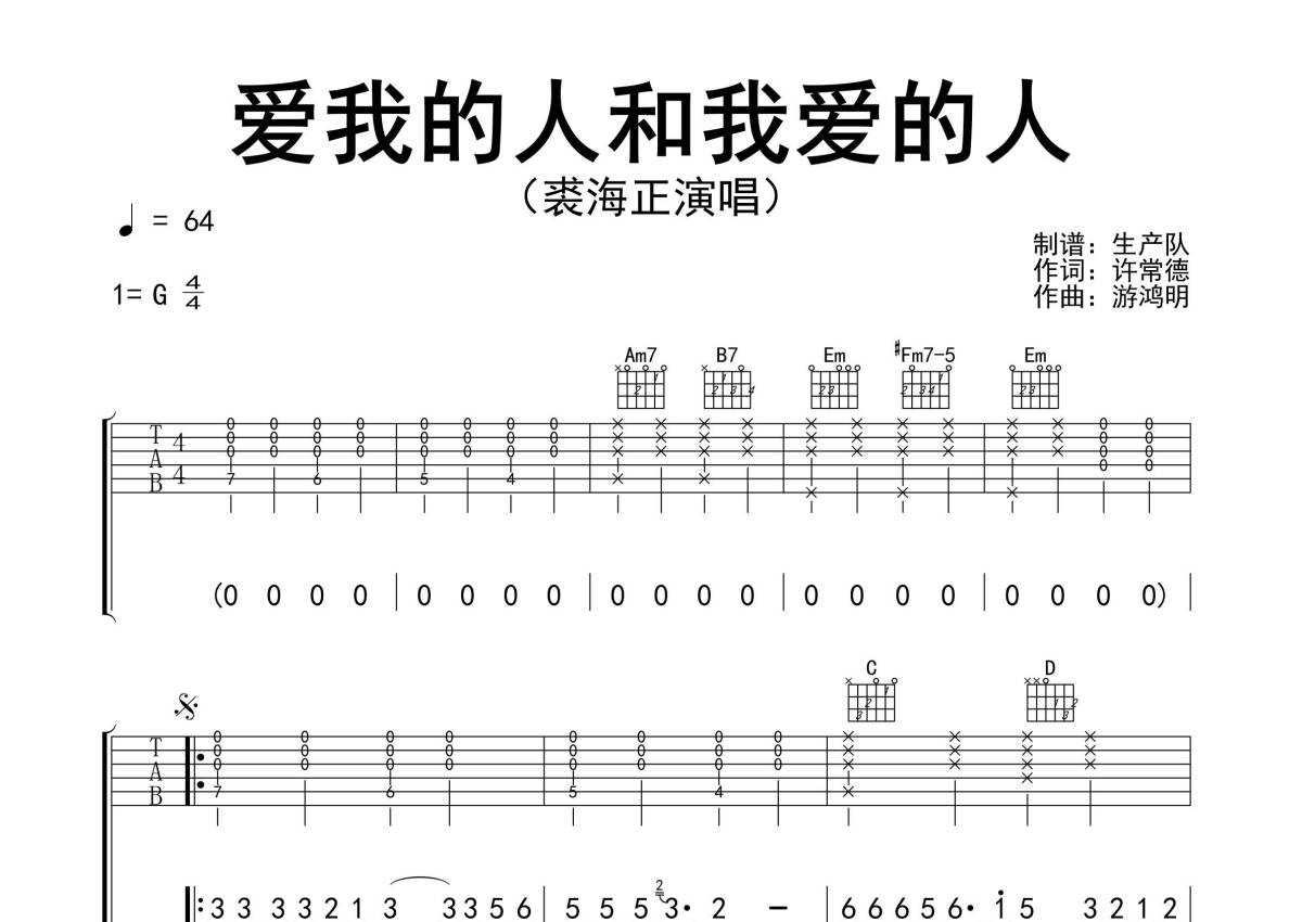 《爱我的人和我爱的人》是裘海正演唱的一首歌曲,精编完美版,拍号为4/4拍,歌曲速度为每分钟64拍,歌曲原调为G调,本吉他谱采用的是G调指法编配,演奏时不需要使用变调夹即为原调,这份吉他谱共有三张高清图谱,图谱由 @生产队 编配上传,图谱使用六线谱编配,包含吉他和弦指法、简谱以及歌词部分,使用这份爱我的人和我爱的人吉他谱,可以让你更加方便地掌握这首歌曲的弹唱技巧,快来尝试吧。《爱我的人和我爱的人》是裘海正演唱的一首歌曲,由许常德作词,游鸿明作曲,收录在裘海正1994年发行的同名专辑《爱我的人和我爱的人》中 。本吉他谱根据原版G调指法编配,完整的前奏、间奏、尾奏编配,怀旧经典!。