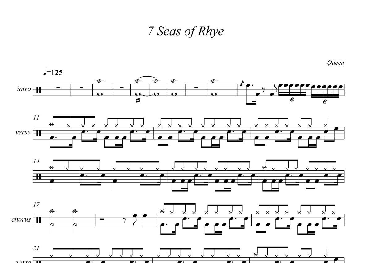 《7 Seas Of Rhye》是Queen演唱的一首歌曲,拍号为4/4拍,歌曲速度为每分钟125拍,这份架子鼓谱共有两张高清图谱,图谱由 @微信用户 编配上传,图谱使用五线谱编配,使用这份7 Seas Of Rhye架子鼓谱,你将能够轻松地敲打出这首Queen的7 Seas Of Rhye,快来尝试吧。