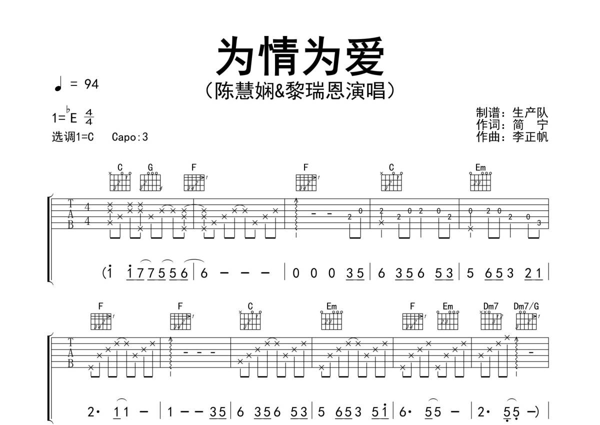 《为情为爱》是陈慧娴、黎瑞恩演唱的一首歌曲,精编完美版,拍号为4/4拍,歌曲速度为每分钟94拍,歌曲原调为Eb调,但由于原调指法比较难,为了方便弹奏,本吉他谱采用的是C调指法编配,变调夹3品弹奏即为原调,当然也可以根据自己的音域改变变调夹位置,或者通过改变和弦调性,以方便自己弹奏,这份吉他谱共有三张高清图谱,图谱由 @生产队 编配上传,图谱使用六线谱编配,包含吉他和弦指法、简谱以及歌词部分,使用这份为情为爱吉他谱,可以让你更加方便地掌握这首歌曲的弹唱技巧,快来尝试吧。《为情为爱》是著名歌手陈慧娴、黎瑞恩的作品之一。本吉他谱根据原版C调指法编配,完整的前奏、间奏、尾奏和SOLO编配,怀旧经典!。