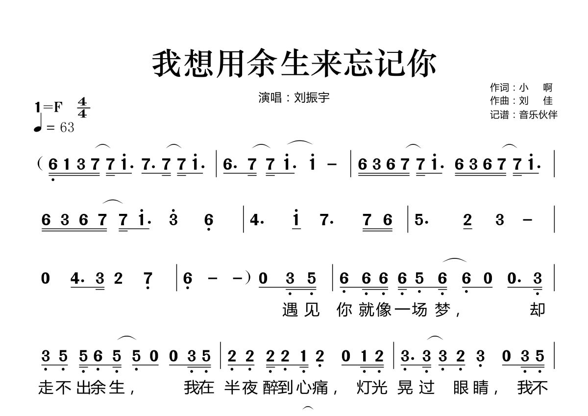 《我想用余生来忘记你》是刘振宇演唱的一首歌曲,这份简谱共有两张高清图谱,图谱由 @音乐伙伴 编配上传。