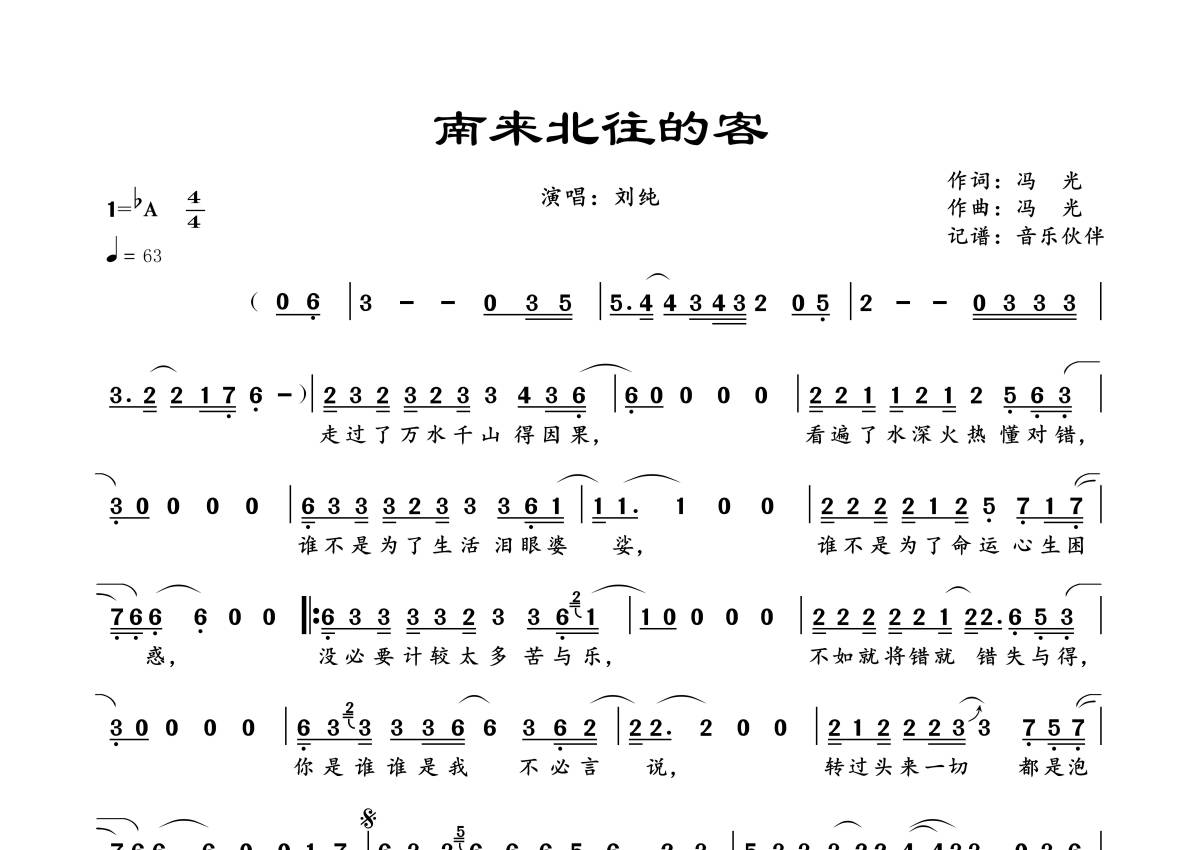 《南来北往的客》是刘纯演唱的一首歌曲,拍号为4/4拍,歌曲速度为每分钟63拍,这份简谱共有一张高清图谱,图谱由 @音乐伙伴 编配上传。