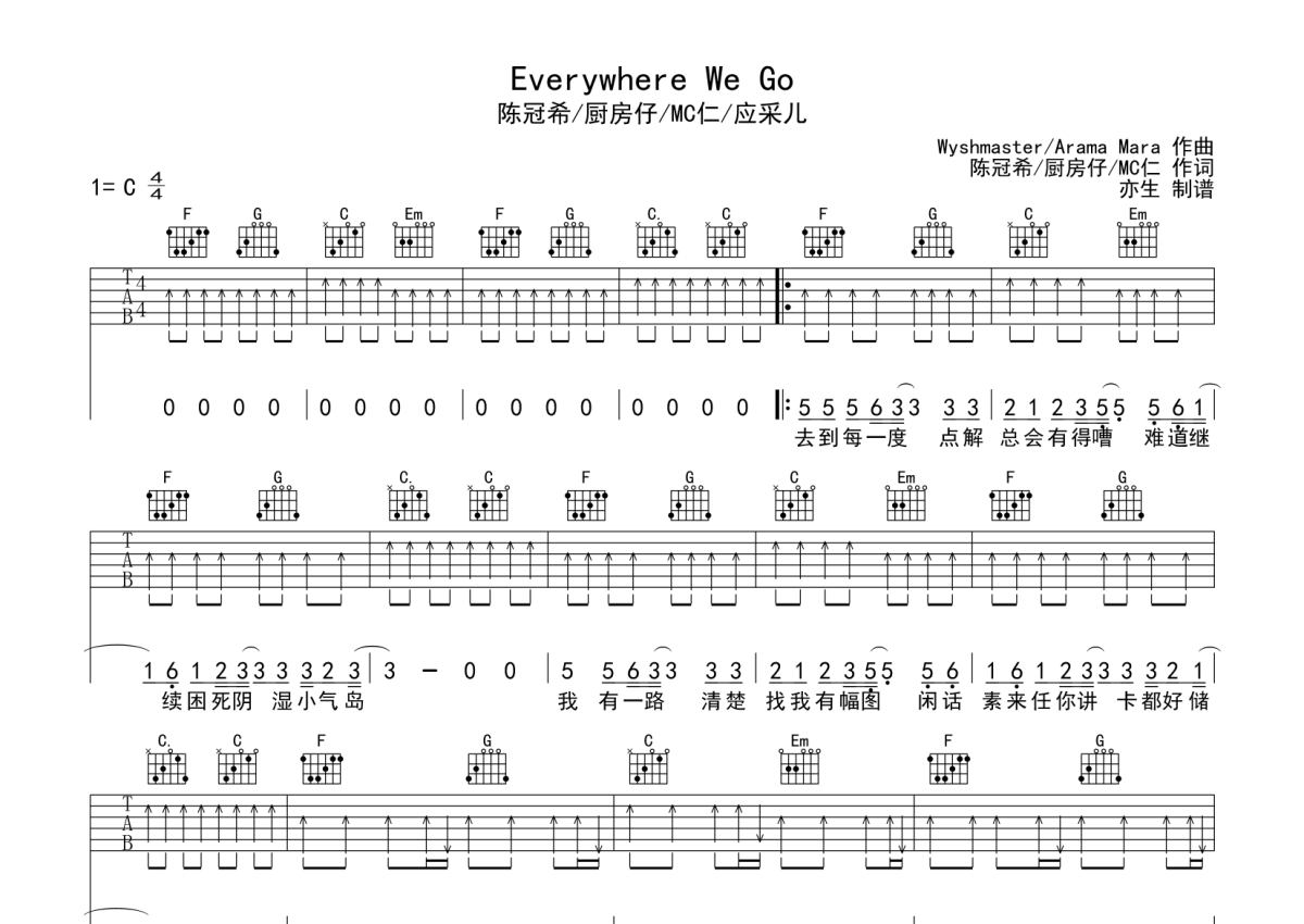 陈冠希/厨房仔/MC仁/应采儿《Everywhere We Go》吉他谱 - C调弹唱六线谱