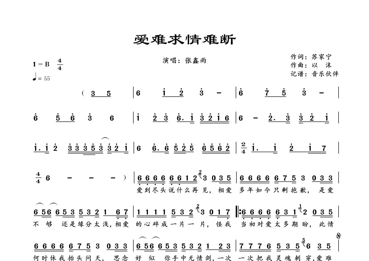 《爱难求情难断》是张鑫雨演唱的一首歌曲,拍号为4/4拍,歌曲速度为每分钟55拍,这份简谱共有一张高清图谱,图谱由 @音乐伙伴 编配上传。