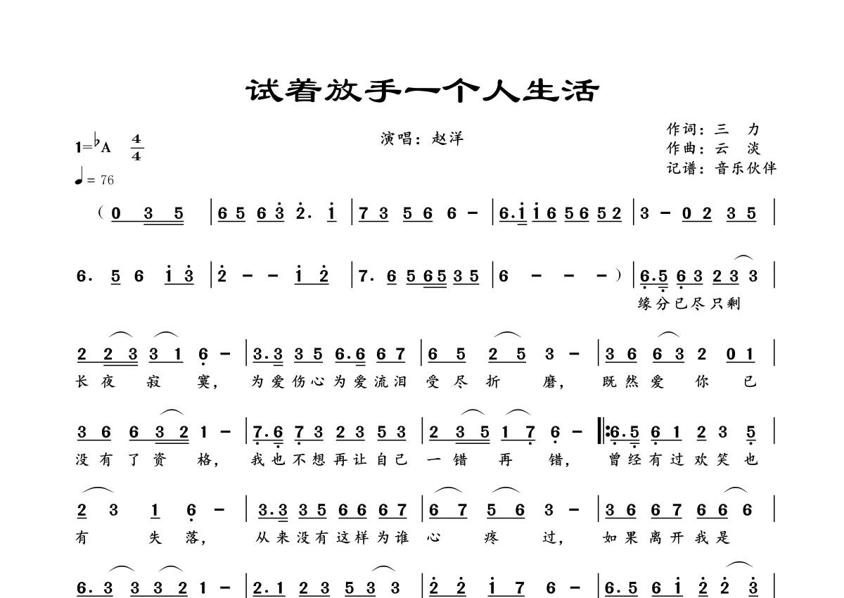 《试着放手一个人生活》是赵洋演唱的一首歌曲,拍号为4/4拍,歌曲速度为每分钟76拍,这份简谱共有一张高清图谱,图谱由 @音乐伙伴 编配上传。