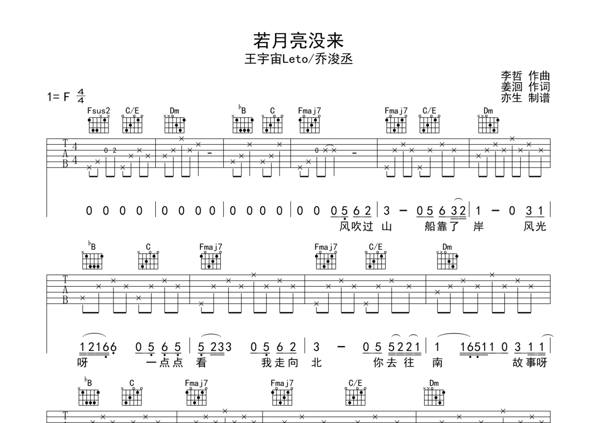 王宇宙/乔浚丞《若月亮没来》吉他谱 - F调弹唱六线谱