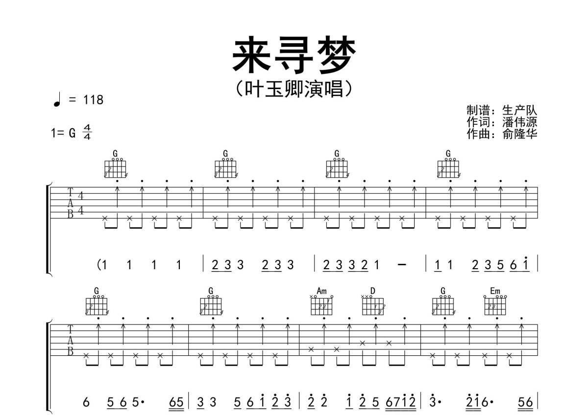 《来寻梦》是叶玉卿演唱的一首歌曲,精编扫弦版,拍号为4/4拍,歌曲速度为每分钟118拍,歌曲原调为G调,本吉他谱采用的是G调指法编配,演奏时不需要使用变调夹即为原调,这份吉他谱共有三张高清图谱,图谱由 @生产队 编配上传,图谱使用六线谱编配,包含吉他和弦指法、简谱以及歌词部分,使用这份来寻梦吉他谱,可以让你更加方便地掌握这首歌曲的弹唱技巧,快来尝试吧。《来...寻梦》是香港艺人叶玉卿原唱的一首粤语歌曲,由潘伟源填词,俞隆华谱曲,收录于同名专辑《来...寻梦》中。本吉他谱根据原版G调指法编配,完整的前奏、间奏及SOLO编配,怀旧经典!。