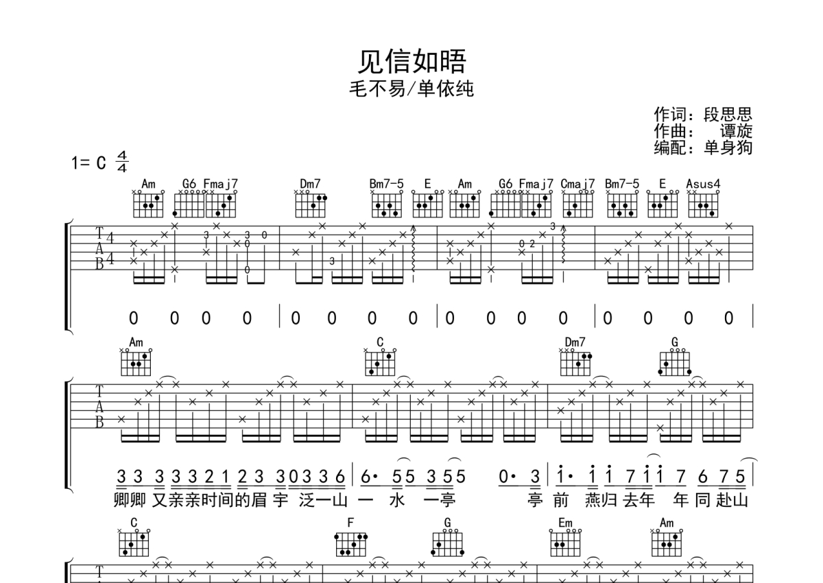 毛不易/单依纯《见信如晤》吉他谱 - C调弹唱六线谱