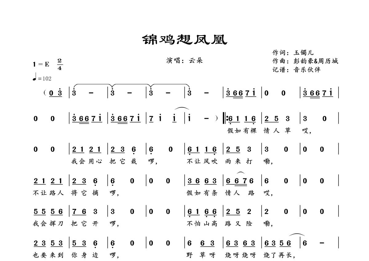 《锦鸡想凤凰》是云朵演唱的一首歌曲,拍号为2/4拍,歌曲速度为每分钟102拍,这份简谱共有一张高清图谱,图谱由 @音乐伙伴 编配上传。