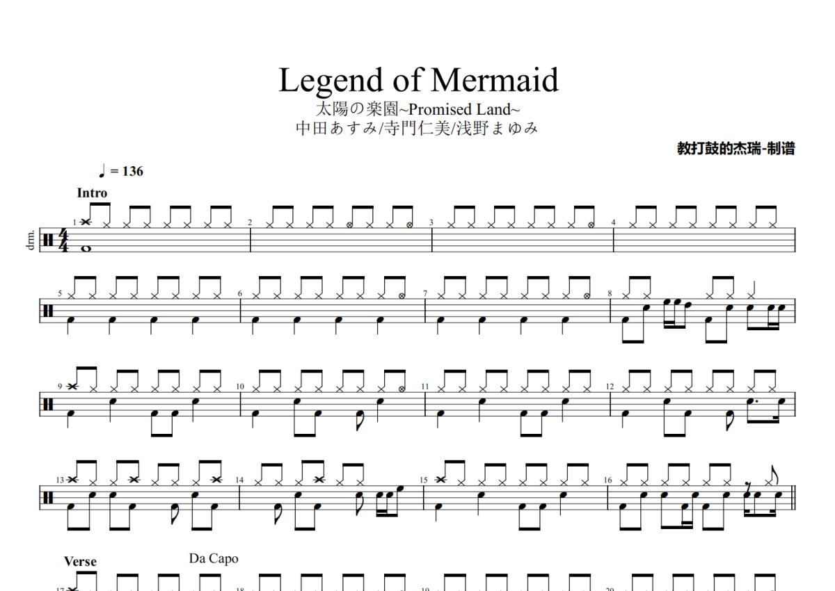 《Legend of Mermaid》是中田あすみ/寺門仁美/浅野まゆみ演唱的一首歌曲,拍号为4/4拍,歌曲速度为每分钟136拍,这份架子鼓谱共有四张高清图谱,图谱由 @Jerry 编配上传,图谱使用五线谱编配,使用这份Legend of Mermaid架子鼓谱,你将能够轻松地敲打出这首中田あすみ/寺門仁美/浅野まゆみ的Legend of Mermaid,快来尝试吧。