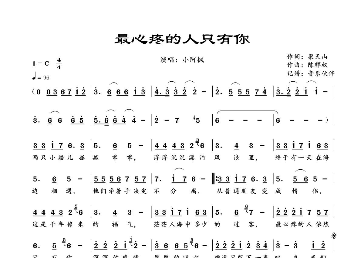 《最心疼的人只有你》是小阿枫演唱的一首歌曲,拍号为4/4拍,歌曲速度为每分钟96拍,这份简谱共有一张高清图谱,图谱由 @音乐伙伴 编配上传。