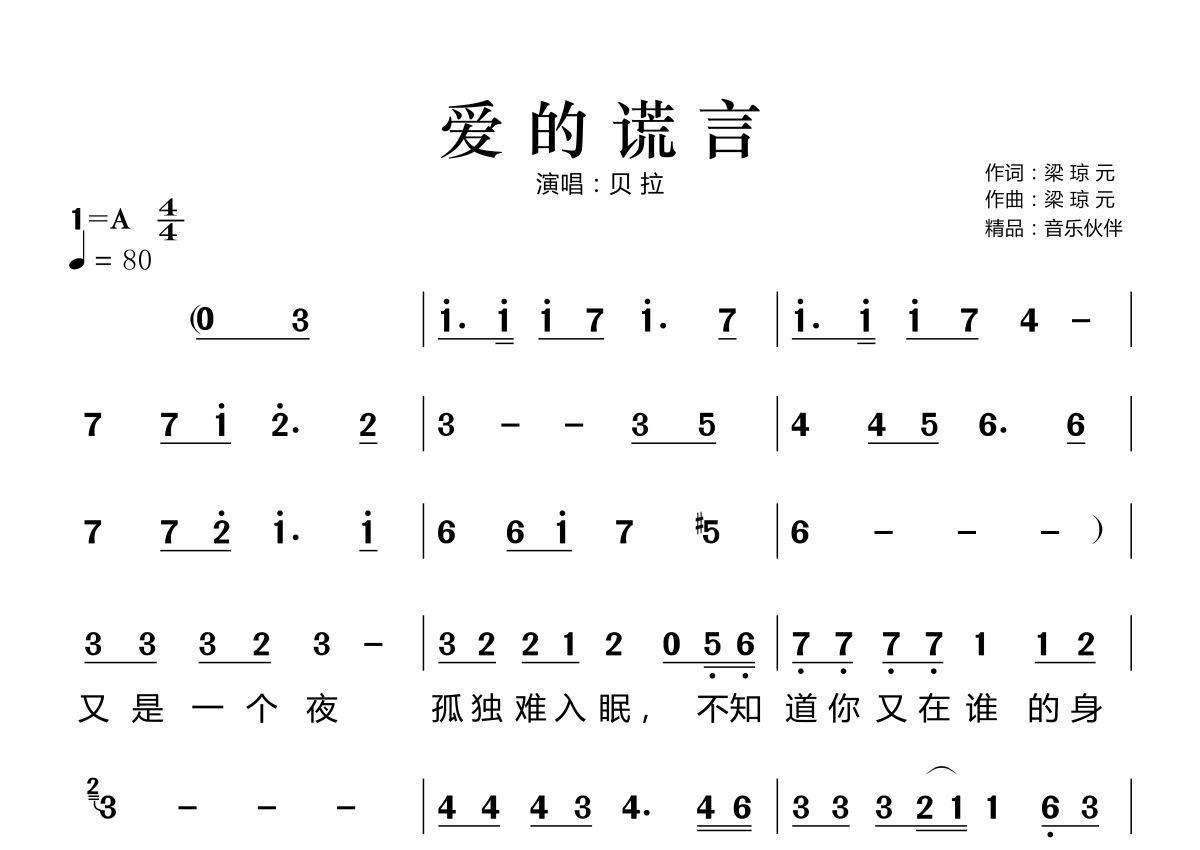 《爱的谎言》是贝拉演唱的一首歌曲,这份简谱共有两张高清图谱,图谱由 @音乐伙伴 编配上传。