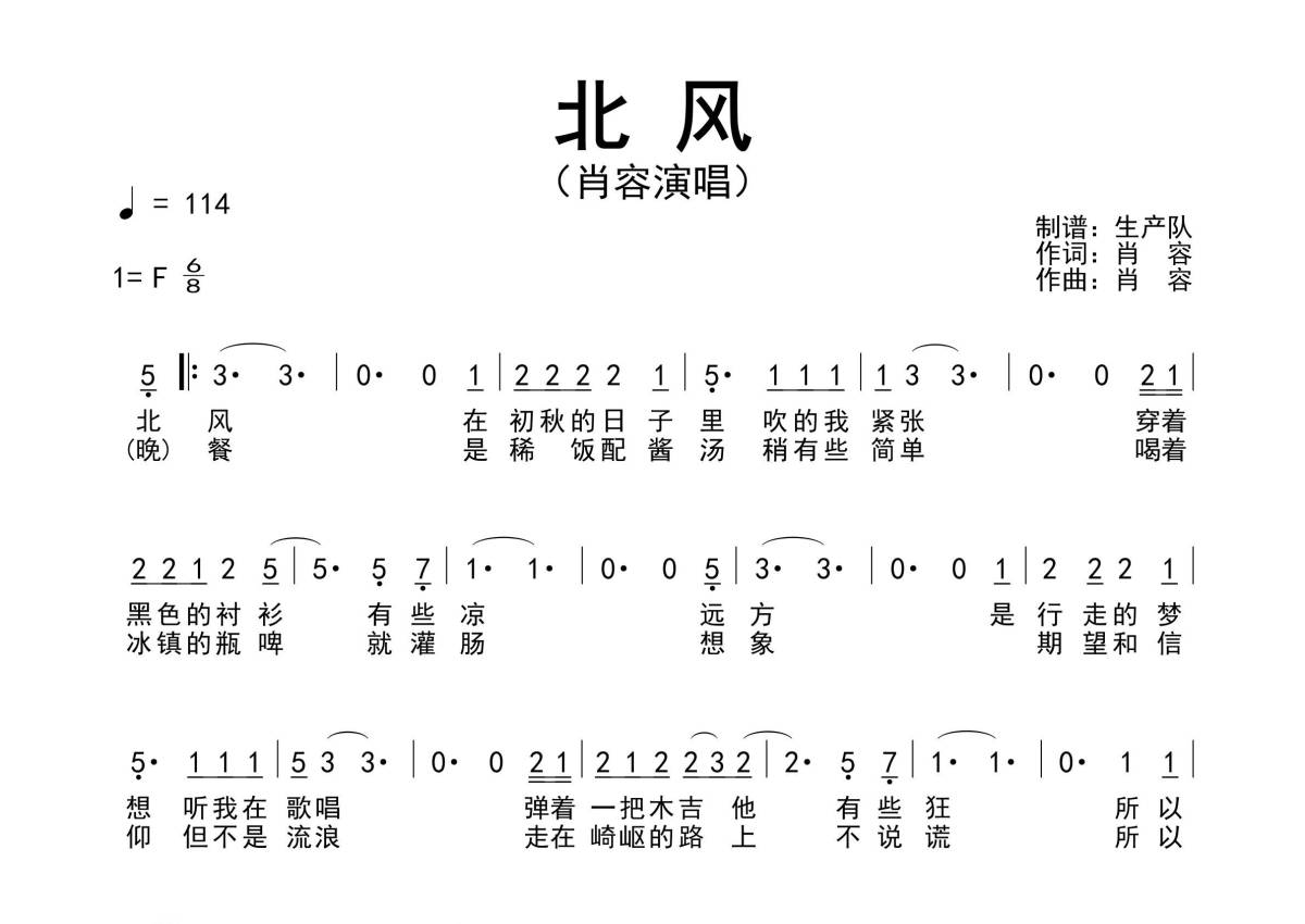 《北风》是肖容演唱的一首歌曲,原版简谱,拍号为6/8拍,歌曲速度为每分钟114拍,这份简谱共有一张高清图谱,图谱由 @生产队 编配上传肖容演唱的民谣歌曲《北风》原版简谱。