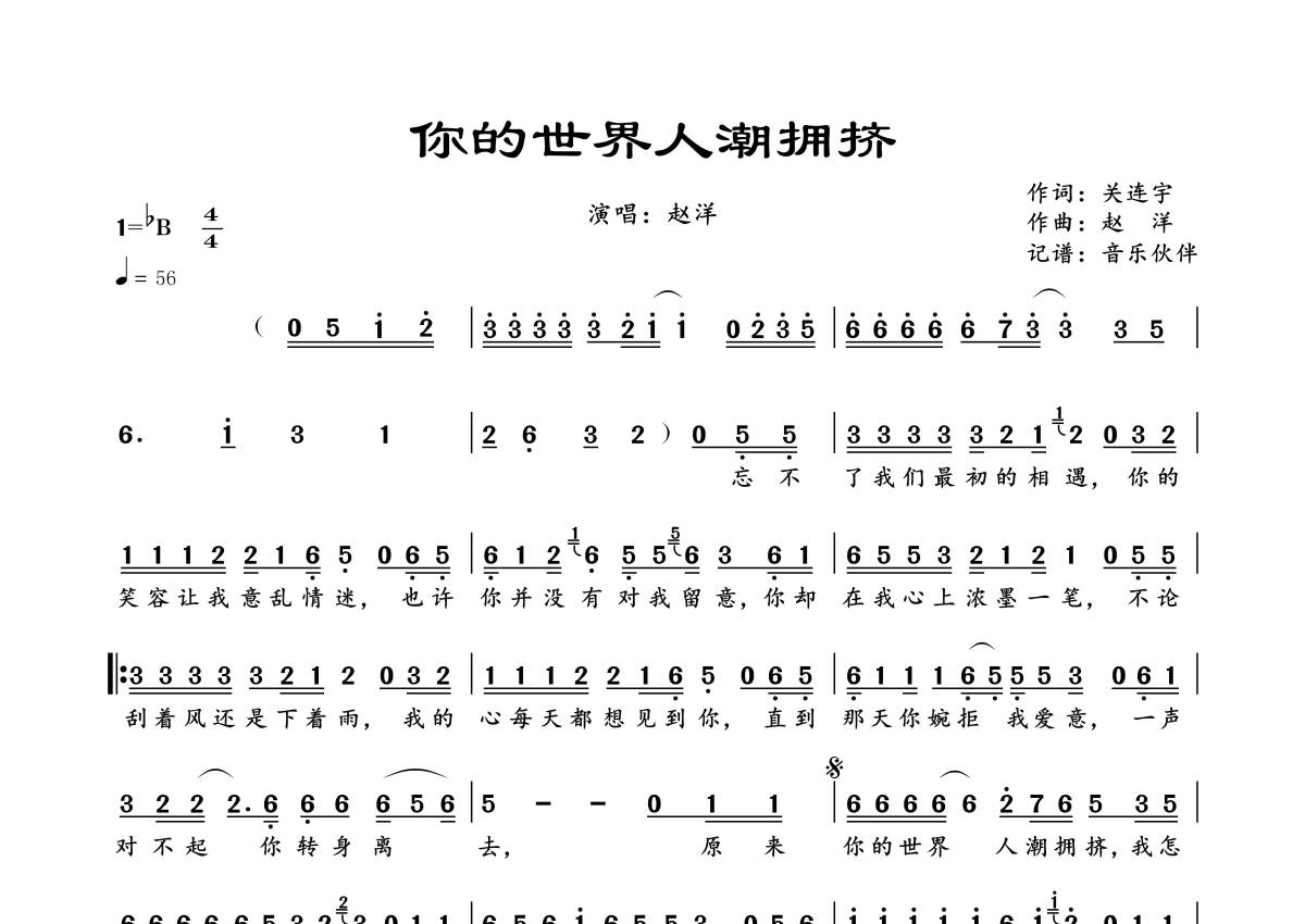《你的世界人潮拥挤》是赵洋演唱的一首歌曲,拍号为4/4拍,歌曲速度为每分钟56拍,这份简谱共有一张高清图谱,图谱由 @音乐伙伴 编配上传。