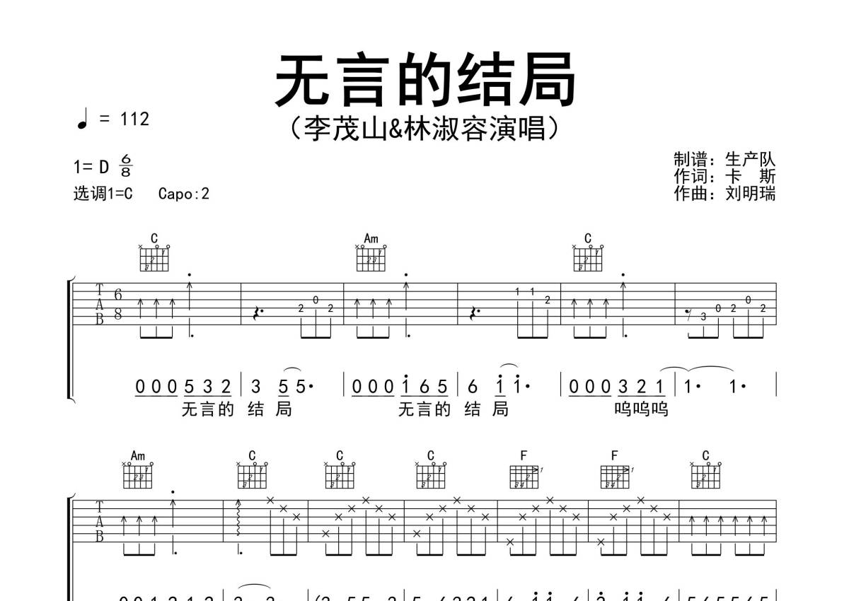 《无言的结局》是李茂山/林淑容演唱的一首歌曲,精编完美版,拍号为6/8拍,歌曲速度为每分钟112拍,歌曲原调为D调,但由于原调指法比较难,为了方便弹奏,本吉他谱采用的是C调指法编配,变调夹2品弹奏即为原调,当然也可以根据自己的音域改变变调夹位置,或者通过改变和弦调性,以方便自己弹奏,这份吉他谱共有三张高清图谱,图谱由 @生产队 编配上传,图谱使用六线谱编配,包含吉他和弦指法、简谱以及歌词部分,使用这份无言的结局吉他谱,可以让你更加方便地掌握这首歌曲的弹唱技巧,快来尝试吧。《无言的结局》是由李茂山&林淑容共同演唱的一首经典歌曲。本吉他谱根据原版C调指法编配,精准的前奏、间奏、尾奏和SOLO编配,精编完美版,怀旧经典!。