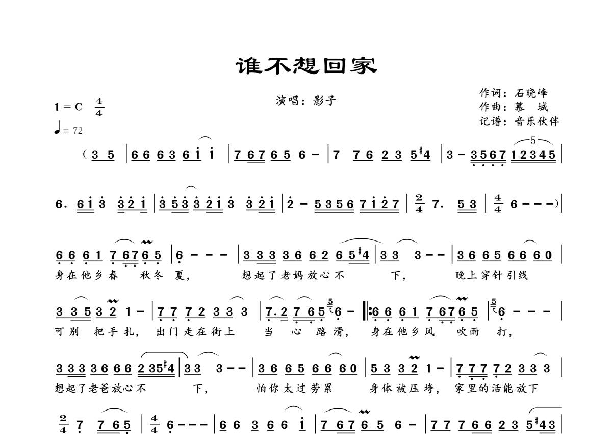 《谁不想回家》是影子演唱的一首歌曲,拍号为4/4拍,歌曲速度为每分钟72拍,这份简谱共有一张高清图谱,图谱由 @音乐伙伴 编配上传。