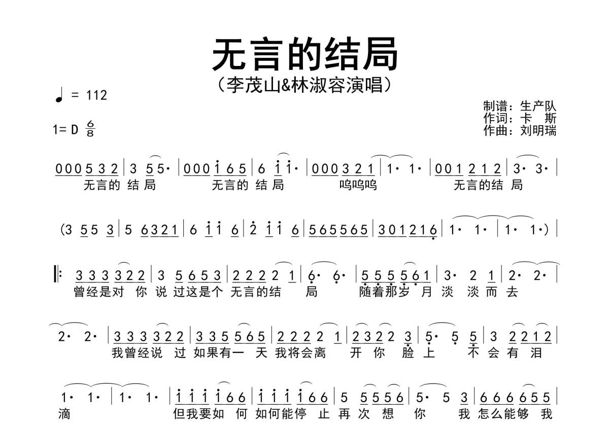 《无言的结局》是李茂山&林淑容演唱的一首歌曲,原版简谱,拍号为6/8拍,歌曲速度为每分钟112拍,这份简谱共有一张高清图谱,图谱由 @生产队 编配上传李茂山&林淑容共同演唱的经典歌曲《无言的结局》原版简谱。