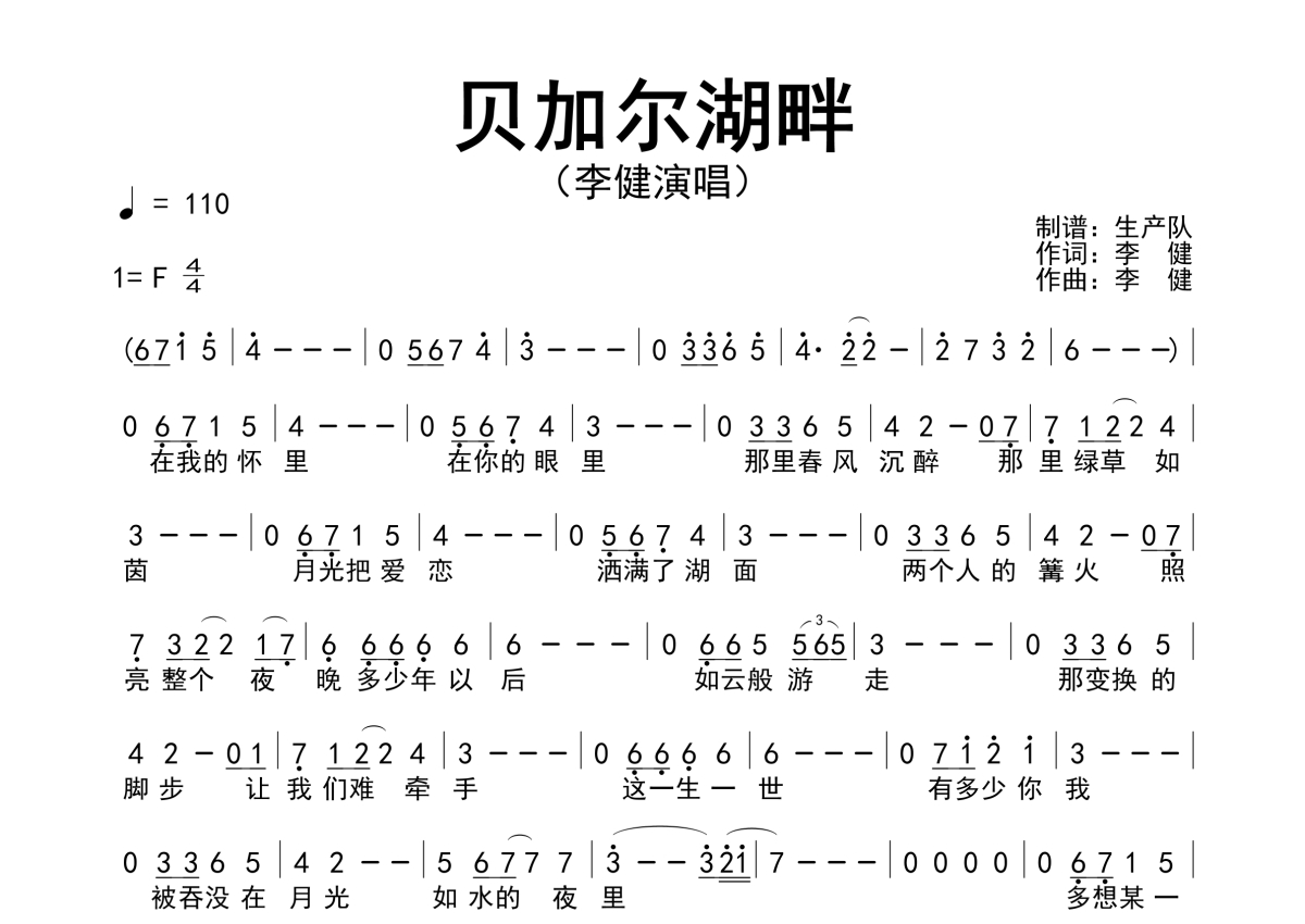 《贝加尔湖畔》是李健演唱的一首歌曲,原版简谱,拍号为4/4拍,歌曲速度为每分钟110拍,这份简谱共有一张高清图谱,图谱由 @生产队 编配上传李健演唱的经典歌曲|《贝加尔湖畔》原版简谱。