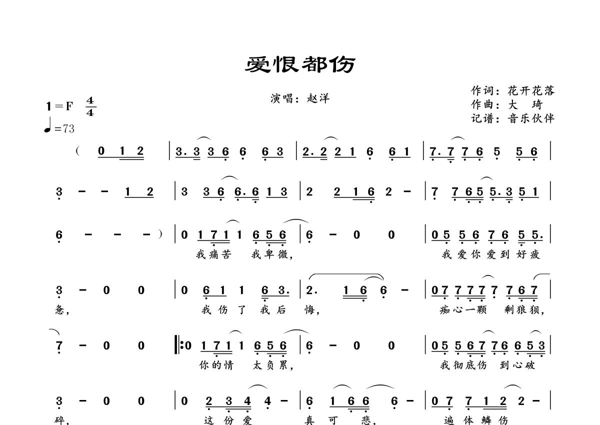 《爱恨都伤》是赵洋演唱的一首歌曲,拍号为4/4拍,歌曲速度为每分钟73拍,这份简谱共有一张高清图谱,图谱由 @音乐伙伴 编配上传。