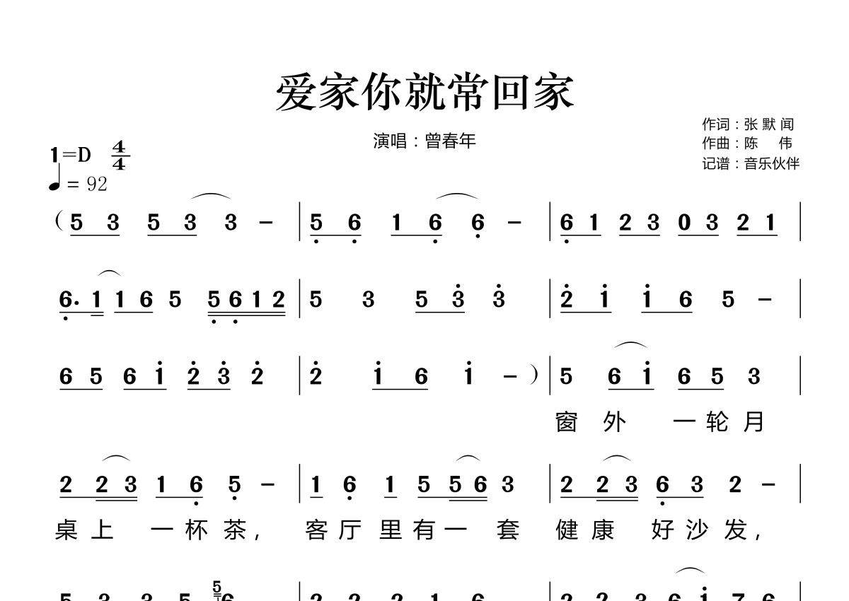 爱家你就常回家简谱 - 曾春年演唱