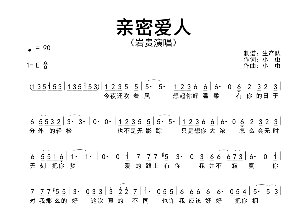 《亲密爱人》是岩贵演唱的一首歌曲,原版简谱,拍号为6/8拍,歌曲速度为每分钟90拍,这份简谱共有一张高清图谱,图谱由 @生产队 编配上传男低音歌手岩贵演唱的《亲密爱人》原版简谱。