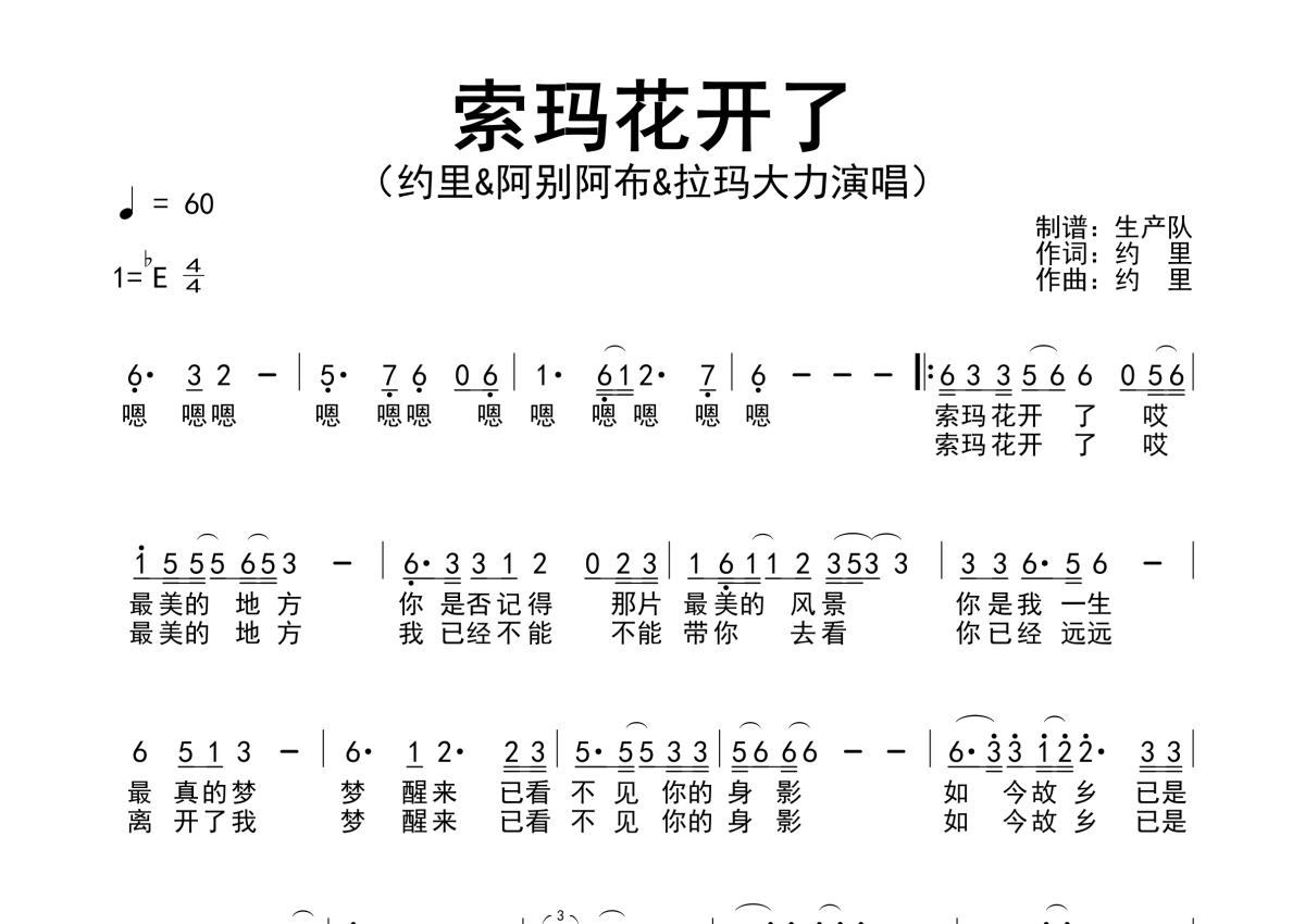 《索玛花开了》是约里 /阿别阿布 /拉玛大力演唱的一首歌曲,原版简谱,拍号为4/4拍,歌曲速度为每分钟60拍,这份简谱共有一张高清图谱,图谱由 @生产队 编配上传约里 /阿别阿布 /拉玛大力共同演唱的歌曲《索玛花开了》原版简谱。